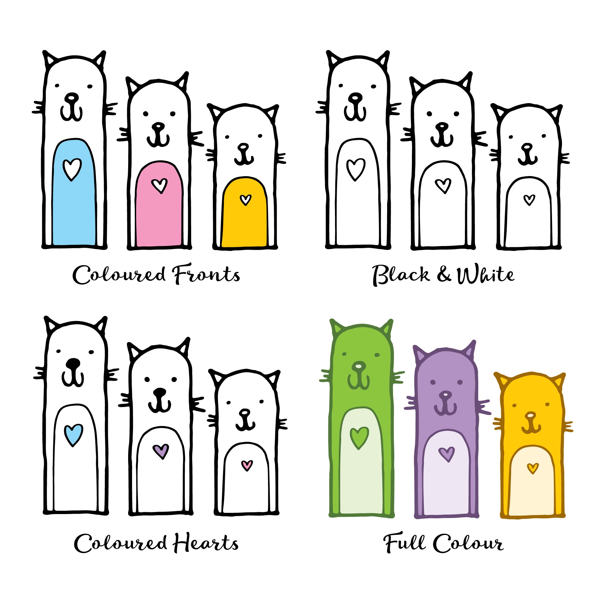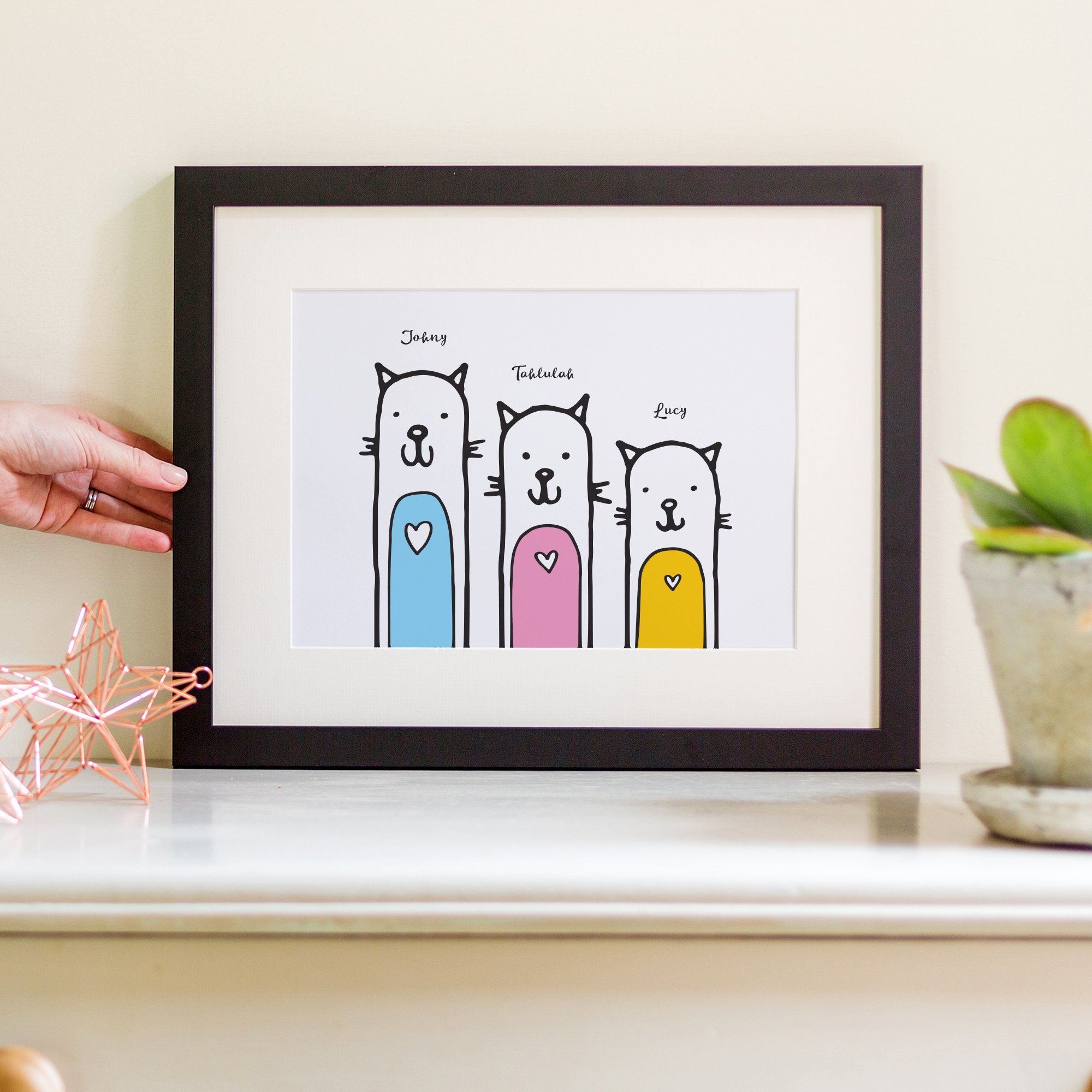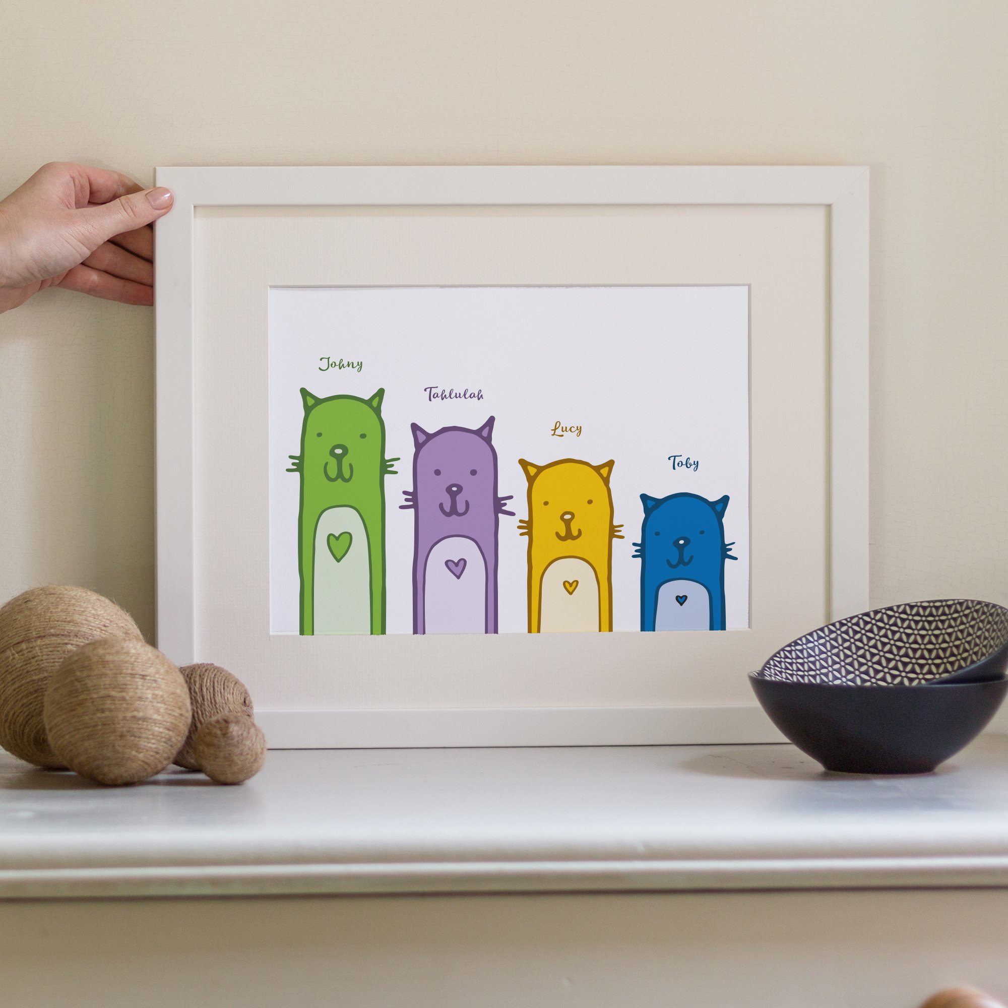 A cute, illustrated personalised print of your family as cats with names underneath. Perfect for cat-lovers. Available in a range of colours and styles.